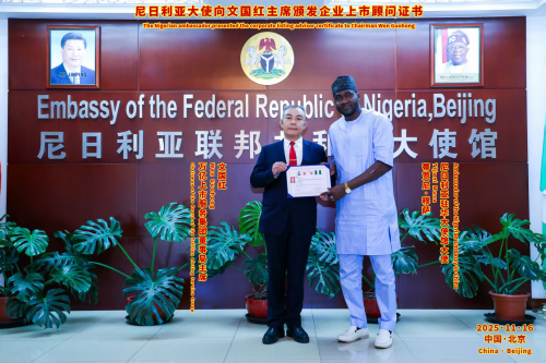作为会谈的重要成果,蒂贾尼·穆萨大使正式聘请文国红主席担任尼日利亚驻华大使馆的企业上市顾问。在庄重的仪式上,大使向文国红颁发了聘书,表彰其在企业上市和中尼交流中的杰出贡献。文国红主席接受证书时表示,这将是一份荣誉与责任,他承诺将尽职尽责,推动更多尼日利亚企业对接全球资本市场。